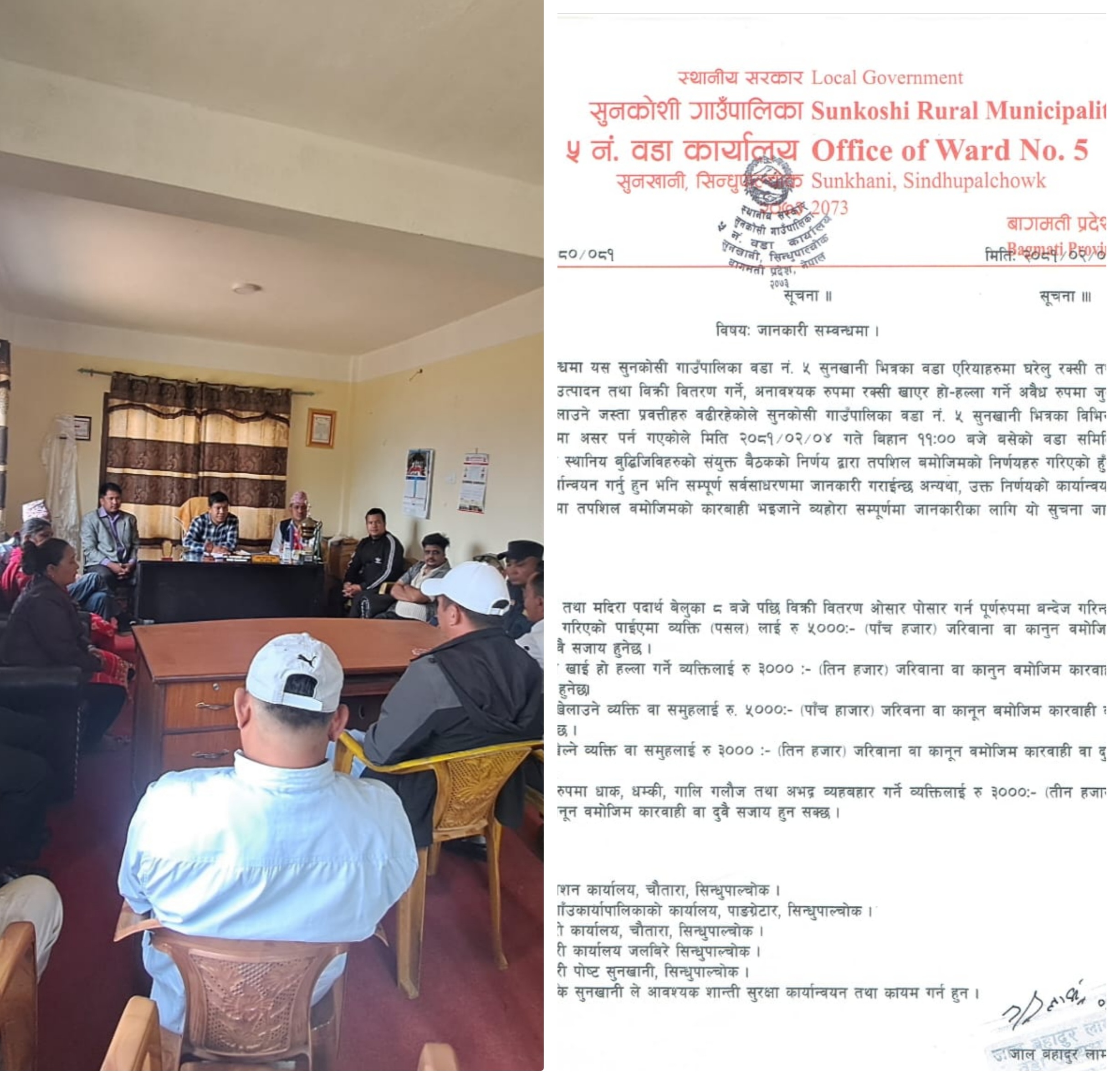 सुनकोशी समाचार जेष्ठ ८ ।।सिन्धुपाल्चोक सुनकोशी गाउपालिका वडा नं ५ सुनखानिमा मादक पदार्थ उत्पादन, सेवन, बिक्री वितरण र…